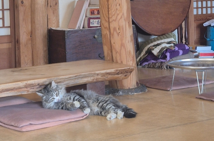 주차를 하고 들어가는데 우와~~ 매화가 피고 고양이가 땅에 누워서 햇볕을 쬐고, 저 높이 앞치마가 널려있는 풍경이 봄이 왔음을 알려준다. 아직 바람이 조금 차갑다고 생각했는데 이곳에 들어가니 따뜻하고 조용한 봄이었다. 계속 어디선가 나오는 고양이들. 사람들과 너무 잘 지내는 아이들이었고, 어떤 아저씨께서 내 친구들과 달리 고양이와 너무 잘 놀아주셔서 "단골이신가 봐~" 했더니 사장님이 "저희 아버지세요" 하신다. 하하하.