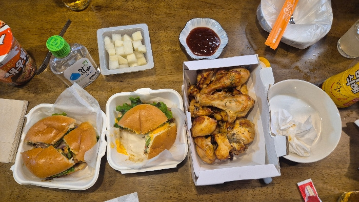 그리고 드디어 숙소로 간다. 이곳도 그저 친구가 예약한 대로 따라간다. 넓고 마당에 장작도 피워놓을 수 있어서 밤에 불멍을 하기로 했다. 누워있고 싶은 맘이 굴뚝같았으나 시간표대로 움직여야 하기 때문에 바로 화엄사로 향했다. 늦은 오후임에도 사람이 많았고, 천황문과 두 개의 석탑을 지나 대웅전을 본다. 홍매화가 핀 곳에서 사람들이 사진을 찍고 있었다. 절, 홍매화, 산, 노을. 내려오면서 극락버거를 사고 치킨을 주문한다. 부처님 계신 곳에서 치킨을 주문하는 것이 왠지 모르게 죄스러워 나오는 길에 주문했다. 그래서 늦게 도착함.
