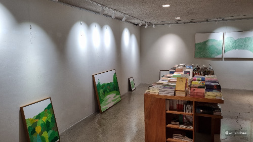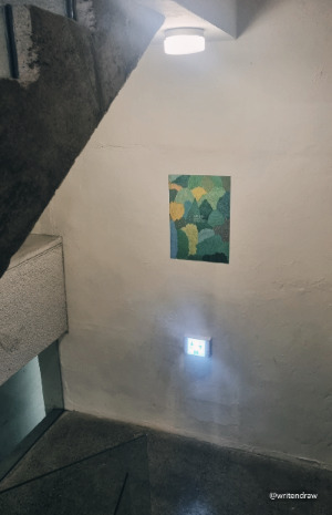 얼추 맘에 드는 배치가 완성되어 본격적으로 그림을 걸기 시작했는데... 이때부터 조명과의 싸움이 시작되었다. 우선 조도 조정이 안되어 멀리서 봐도 그림이 날리는 부분이 생겨서 조명을 수도 없이 왔다 갔다 했던 것 같다.(결국 100% 맘에 들지는 않지만 내가 할 수 있는 최선이라고 생각한다.)