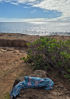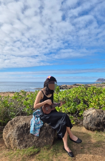 며칠간 러닝을 하며 물색한 장소는 야자수 옆에 바위가 있는 해변이다. 파도 앞에 앉아 우쿨렐레를 들었다.