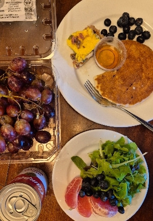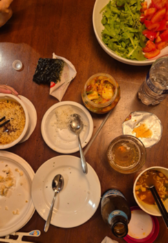 아침은 항상 누룽지와 김, 그리고 각종 남은 음식들이다(팬케이크와 할라피뇨). 첫날 사온 야채와 과일도 잔뜩 차려놓고 먹는다.