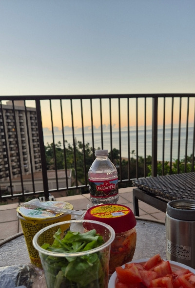 아침 일찍 컵라면에 물을 받아 테라스 선배드에 앉아 밖을 보았다.