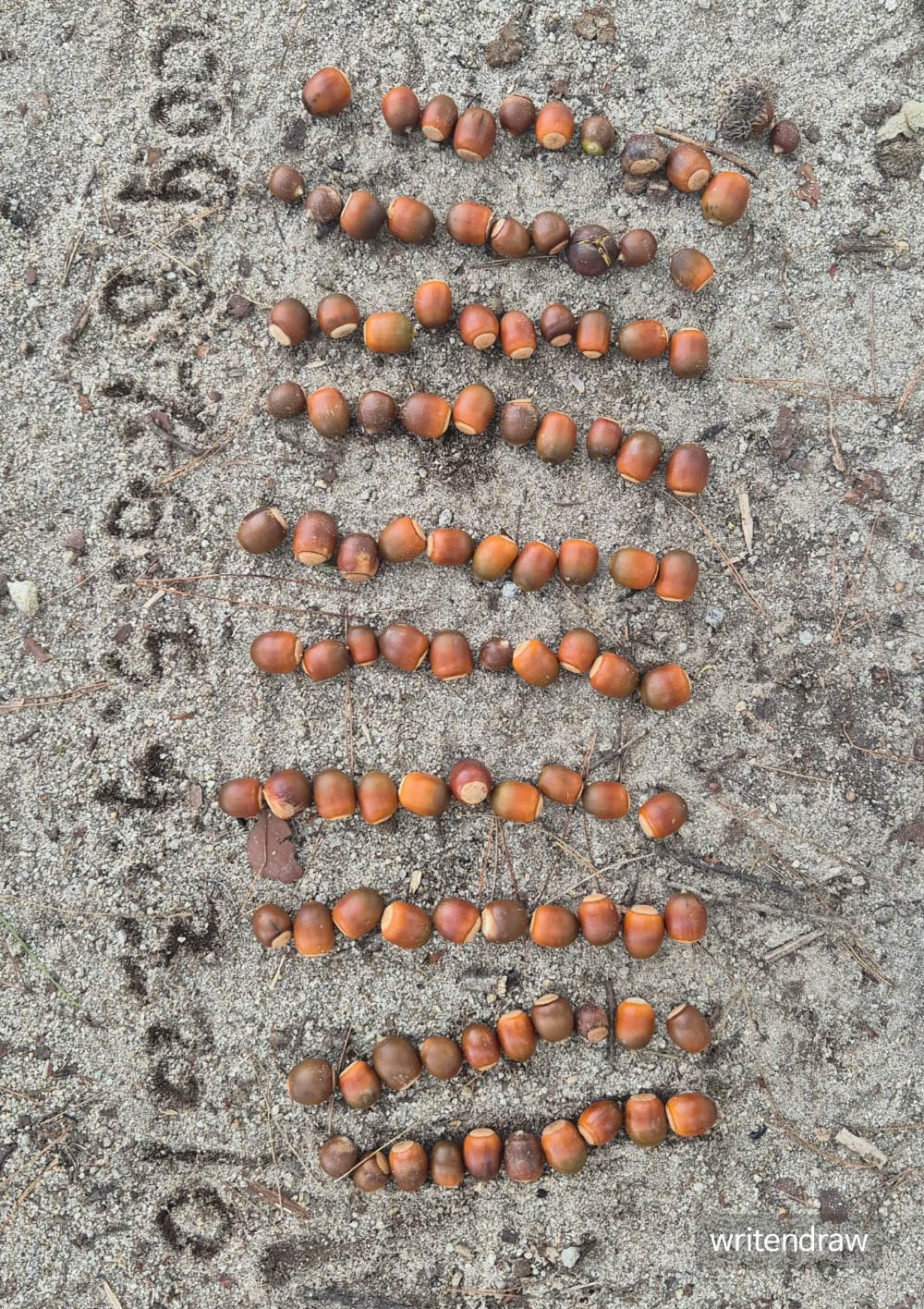 하늘을 올려다보니 머리 위에 참나무가 있었다. 다시 땅을 보니 도토리가 수도 없이 떨어져 있었고, 우리는 그 도토리를 주워다가 10개씩 열 꾸러미를 만들어보기로 했다.