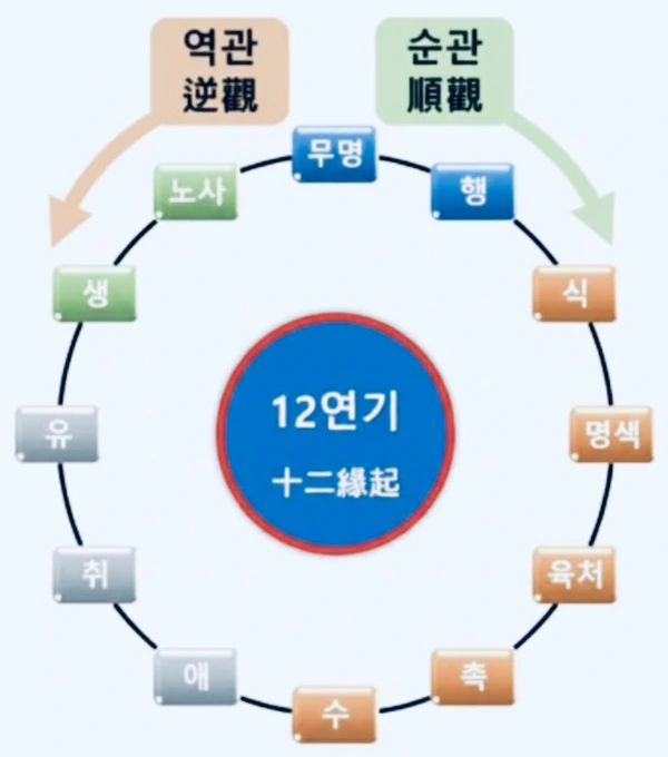 한편, 12연기를 이용한 고통의 소멸방법에는 순관(順觀)과 역관(逆觀)이라는 두 가지가 있습니다. 먼저 고통이 어떻게 발생되고 전개되는지를 순서대로 관찰하는 순관(順觀), 즉, 유전연기(流轉緣起: 고통의 발생)의 방법이 있습니다. 이것은 마치 엉킨 실타래의 시작점을 찾는 것과 같습니다. 결국 순관은 고통의 시작이 진리를 알지 못하는 무명(무지)한 상태에서 비롯되며, 그 무명(무지) 때문에 욕심이나 분노와 같은 생각과 행동이 일어나 급기야 늙고 병들어 죽는 고통으로 이어진다는 사실을 밝힘으로써, 고통의 사슬을 끊어낼 수 있는 방법을 제시해 주고 있습니다.