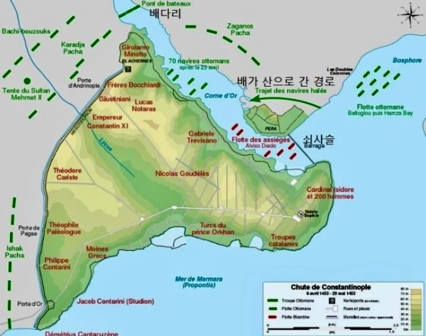 오스만제국(Osman Empire)의 제7대 술탄인 21세의 젊은 정복자 메흐메트 2세(Mehmed II)는 A.D. 1453년에 난공불락이라 불리던 비잔틴제국(동로마제국: A.D. 330-1453)의 수도 콘스탄티노플(비잔티움)을 함락시켰습니다. 그는 골든혼(Golden Horn: 금각만)만의 입구에 쳐져 있는 쇠사슬을 피하기 위해서, 야밤에 함대를 산 위로 끌어올려서, 이를 골든혼(Golden Horn: 금각)만의 안으로 다시 띄우는 기상천외한 전략으로 철옹성 같았던 콘스탄티노플 성벽을 무너뜨렸습니다.