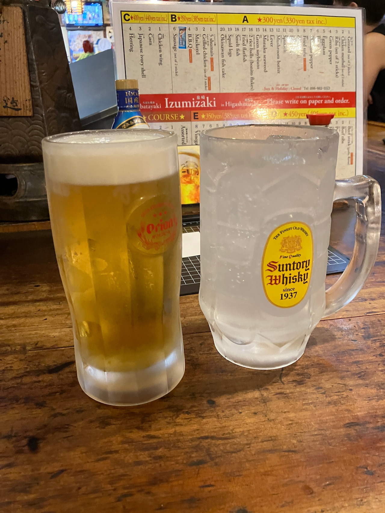 오키나와의 현지 맥주는 오리온 맥주다. 짝꿍은 하이볼 비슷한 것을 주문했는데 자기 얼굴보다 잔이 나와서 두 손으로 마실 수밖에 없었다. 예의를 절로 갖추게 되는 크기였다.