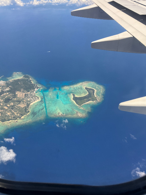비행기가 떠나고 두 시간 남짓 됐을까. 창밖으로 펼쳐진 진풍경에 목이 빠져라 창쪽으로 고개를 내밀었다. 새파란 대양 위에 터키옥색 물감을 한 방울 떨어뜨려놓기라도 한 듯했다. 비행기표를 끊게 한 '장본인'이 저기 있었다. 일본의 에메랄드 빛 바다가 어서 오라며 우리에게 손짓하고 있는 것만 같았다.