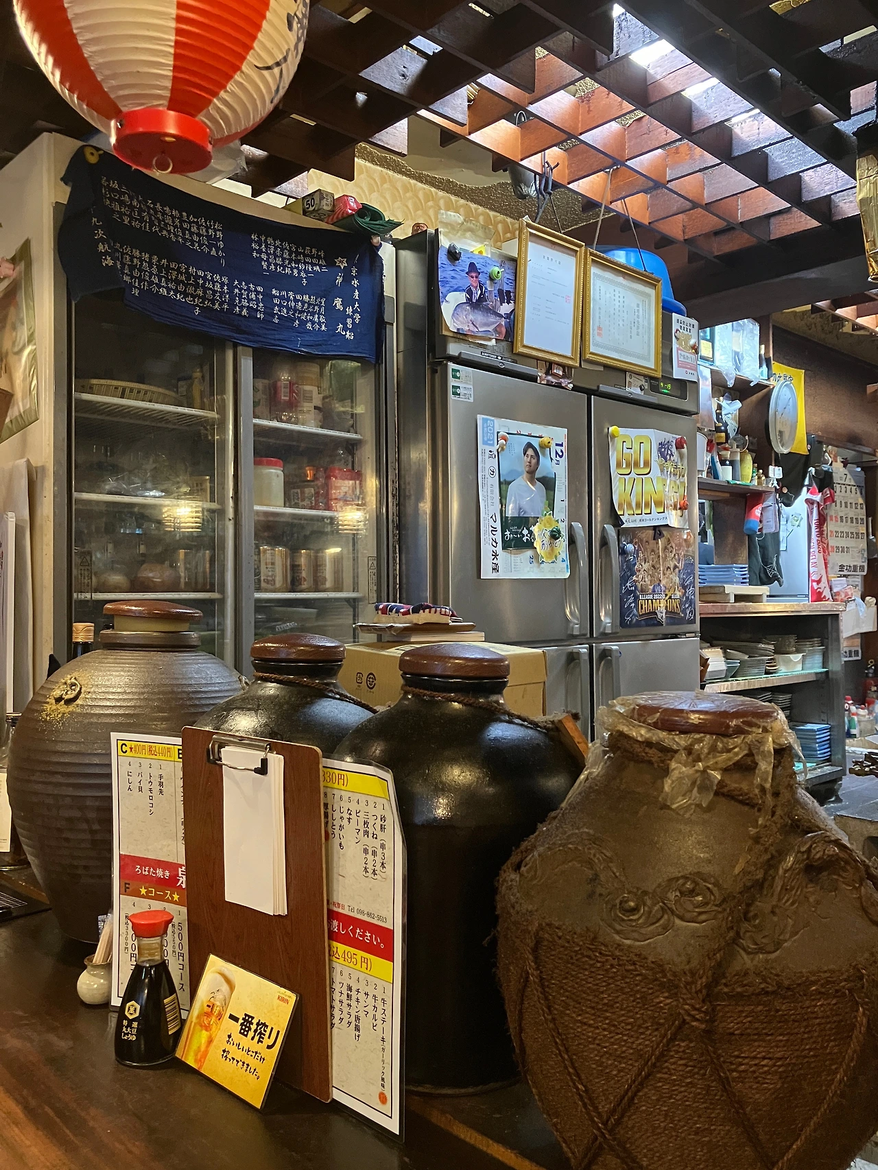 가게 문을 열려고 하자 벌써부터 술이 거나하게 취한 것 같은, 축구 유니폼 복장의 외국인 아저씨가 나왔다. 손님이 담배 태우러 나왔나 싶었는데 알고 보니 사장님이셨다. 덕업일치(?)의 사장님이라니, 여기로구나 싶었다. (실제로 그 사장님은 홀 가운데에 있는 오픈 형태의 주방에서 조리를 하면서 냉장고에서 스윽 기린이치방 캔맥주를 꺼내어 한모금씩 마시며 일을 하고 계셨다)