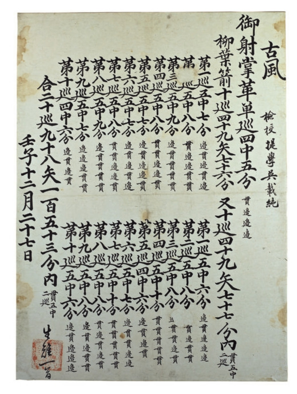 태조 이성계는 다섯 마리의 까마귀를 모두 맞히거나 담비 스무 마리를 모두 화살로 쏘아 맞혔다는 기록이 문헌에 남아있다. 정조 임금이 10순(50발)을 쏴서 49발을 맞히고 나머지 1발은 일부러 맞히지 않았다는 기록은 유명하다. 10순에 49발이면 한 순(5발)을 쏘면 평균 4.9발을 맞힌다는 뜻이다. 대한궁도협회의 승단 기준 중 가장 높은 9단이 9순(45발)중 39발이다. 한 순 기준 평균 4.3발을 맞히는 수준이다. 9단도 정조에겐 비빌 수가 없다.