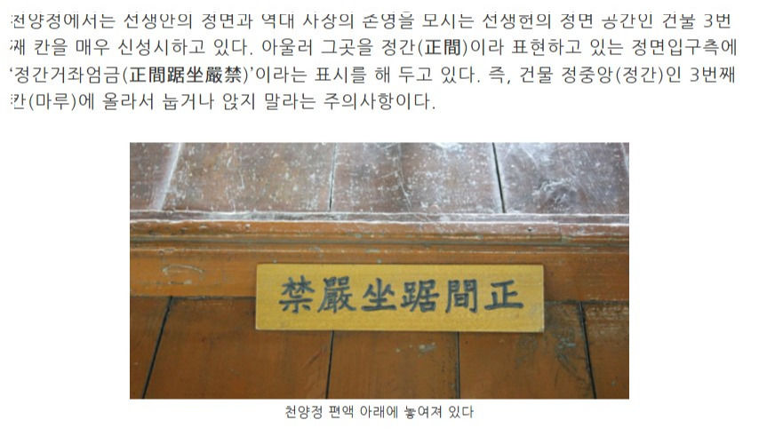 이상의 내용에서 보면 정간이라는 것이 존재했고, 거기에다 인사를 하면서 마음을 다잡는 풍습이 천양정에 존재했음을 알 수 있다. 그런데 처음에는 '정간正間'이라는 한자를 써붙인 현판 같은 건 애초에 존재하지 않았다는 것도 알 수 있다.* 하지만 여전히 마음을 다잡고 즐겁게 활을 쏘다 가겠다는 뜻은 좋은데 왜 정간에다 인사를 해야 하는지는 이유가 불분명했다. 이에 대해서는 추후에 이어진 담화 내용에 드러나 있다.