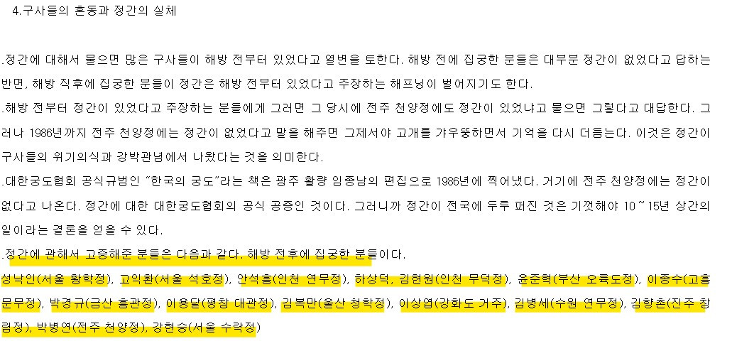 두 번째로, 저 규례가 왜 등장했는지에 대한 맥락에 대한 이해가 없이 규례만을 근거로 들어버리는 것은 아전인수식 해석이라는 비판에서 자유롭기 어렵다. 이제는 대화조차 나눌 수 없는 역사의 산 증인들이라고 할 수 있는, 해방 전에 집궁했던 구사 옹들을 직접 대면하거나 통화를 녹취하여 국궁계 발전에 이바지 한 정진명 접장(현 (사)온깍지협회 회장)은 정간에 관해서도 유의미한 기록을 남겨두었다.
