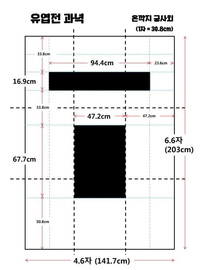 1자의 기준을 조선 시대의 영조척(약 30.8cm)으로 두고 계산하면, 가로 141.7cm에 세로 203cm의 크기가 된다. 그런데, 현재 협회에서 사용하는 과녁의 사이즈는 가로 145cm에 세로 265cm다. 이를 역으로 환산하면 1자를 30.3cm으로 계산했음을 알 수 있다. 그 수치는 일본의 1자 기준이다. 광무개혁 때 일본의 자를 그대로 도입한 흔적의 잔재 같아 아쉬움이 느껴지는 부분이다.