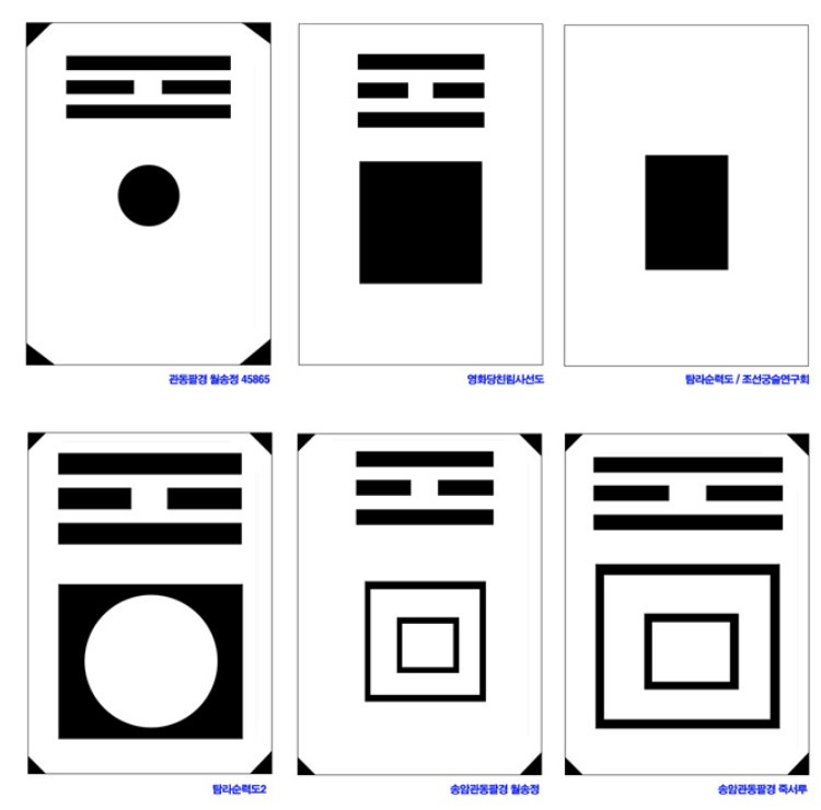 공통적으로 등장하는 괘는 주역의 리괘(履卦, ☲ )다. 리 괘는 불(火)을 상징한다. 동양철학의 근간이 되는 음양오행 사상에서 화(火)는 남쪽을 가리킨다. 조선시대에는 임금이 정좌하여 백성을 내려다보는 쪽을 북쪽이라고 했으므로, 과녁을 보는 입장에서는 위쪽이 남쪽이 되고 아래쪽이 북쪽이 되니 과녁의 위에 리괘가 공통적으로 등장하는 것은 바로 그런 맥락에서 일 것이다. <탐라순력도>의 다른 그림을 봐도 주역의 괘를 통해 방위를 표현한 부분을 관찰할 수 있다.