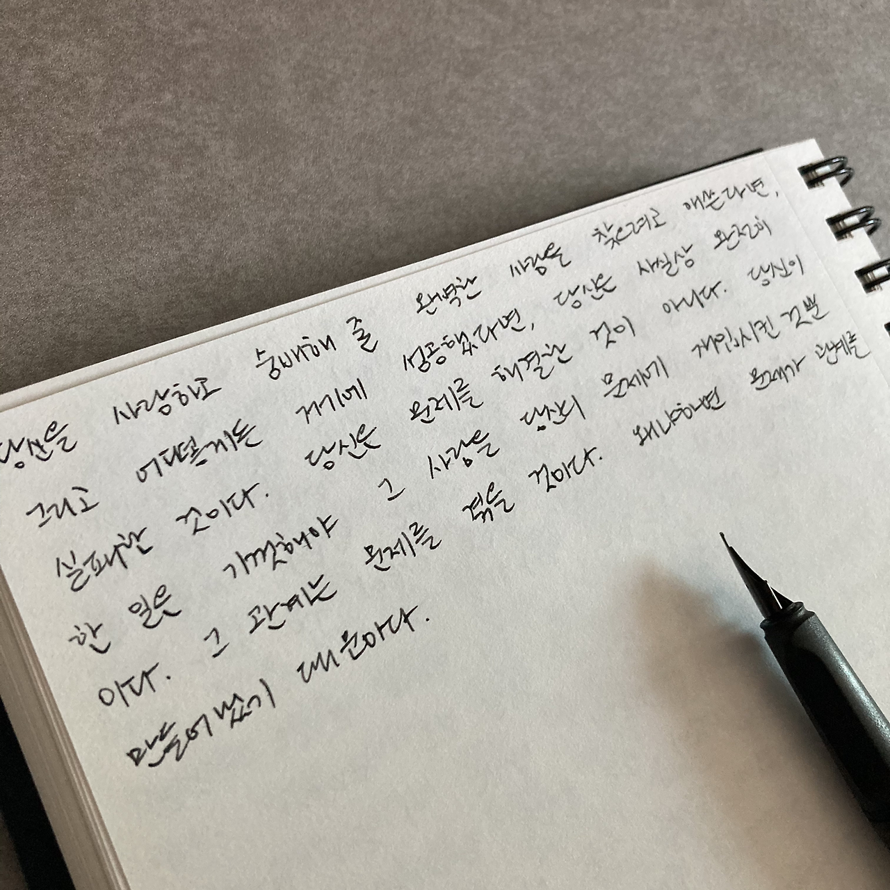 바쁘게 운동과 샤워까지 마쳐도 아직 오전이다. 이제 여유롭게 모닝커피를 한잔 하면서 좋아하는 책의 구절들을 20분 정도 필사하는 시간을 갖는다. 전자 책보다 종이책이 뭔가 책을 읽는 느낌이 나는 것처럼, 책이라는 것은 눈으로만 볼 때와 낭독을 하면서 읽을 때가 다르고, 손으로 직접 그 문장을 머리와 가슴에 새기면서 읽을 때는 더 깊이 있는 독서가 가능하다. 메모하듯 흘려 쓰는 것이 아니라 또박또박 정자로 천천히 단어 단어를 적어나가고 있으면 어느새 잡념은 사라지고 책과 나 사이에 펜과 종이, 만년필만이 남는다.