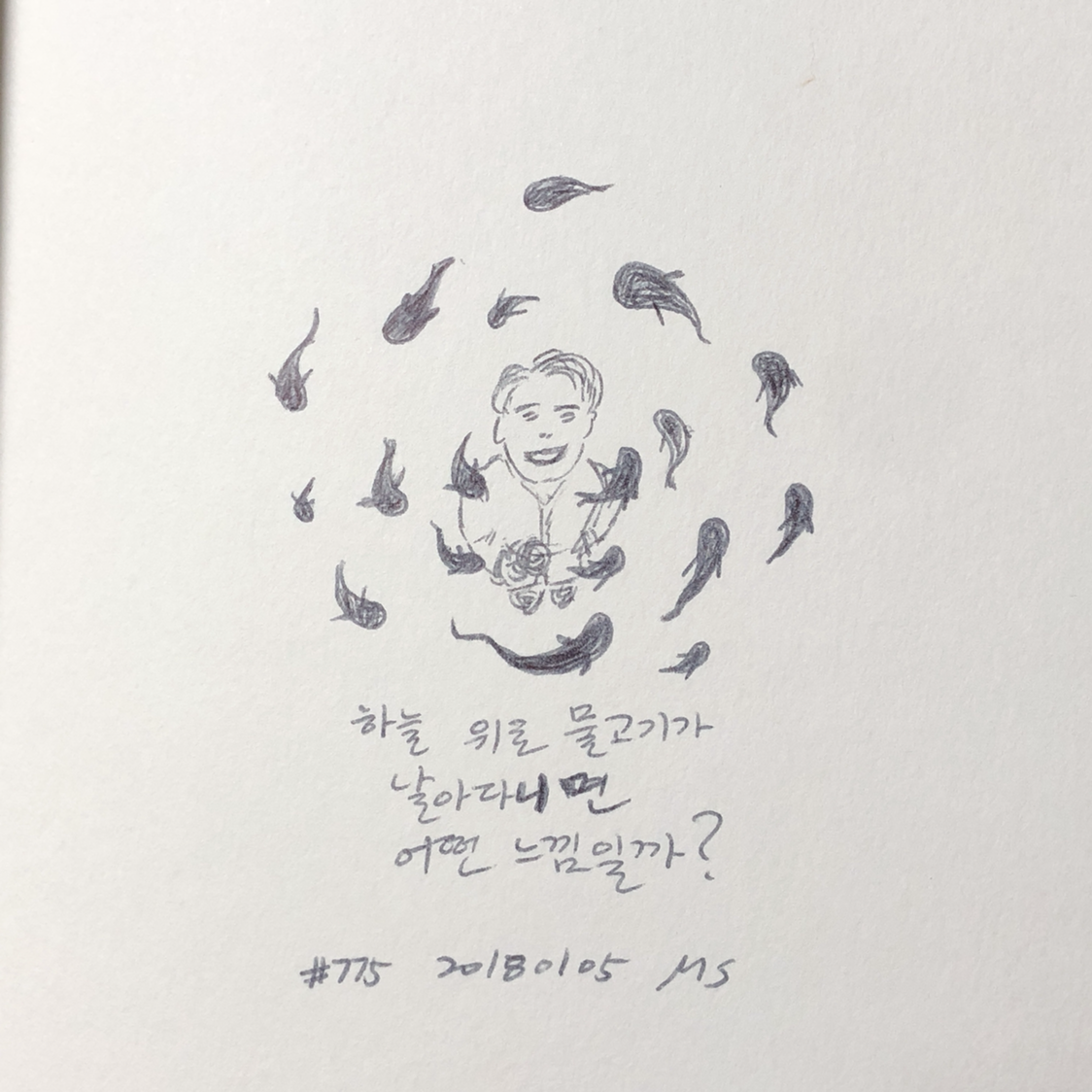 A: 하늘 위로 물고기가 날아다니면 어떤 느낌일까?B: 낙옆이 떨어지지 않고 하늘을 빙빙 도는 느낌 아닐까?C: 금빛이나 은빛 나는 물고기들이 반짝여서 클럽에 온 느낌이 날 듯 한데?D: 고양이가 날아다니고 싶어하겠지. 그러다가 새처럼 진화할지도 모르고. A: 잠자리채가 잘 팔릴 수도 있겠다. 그치?#fiction #픽션