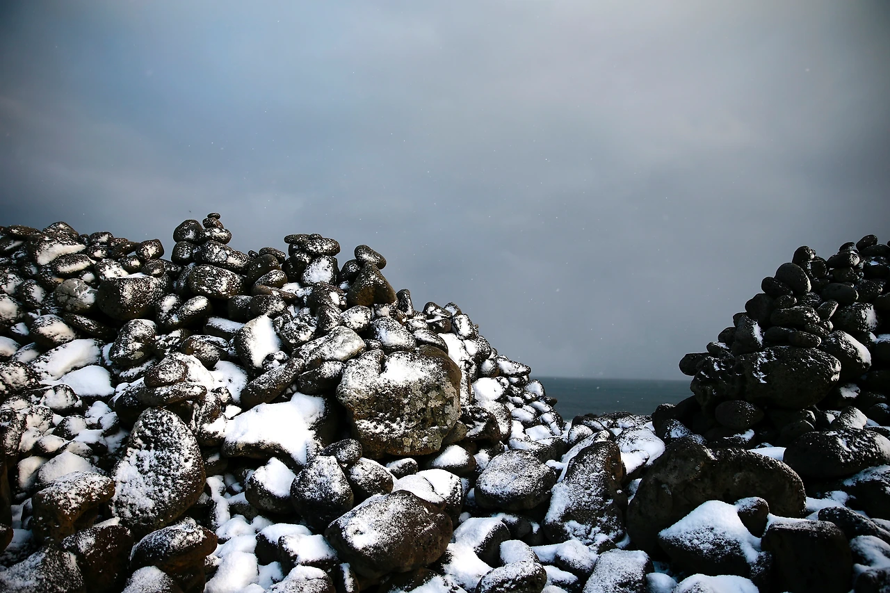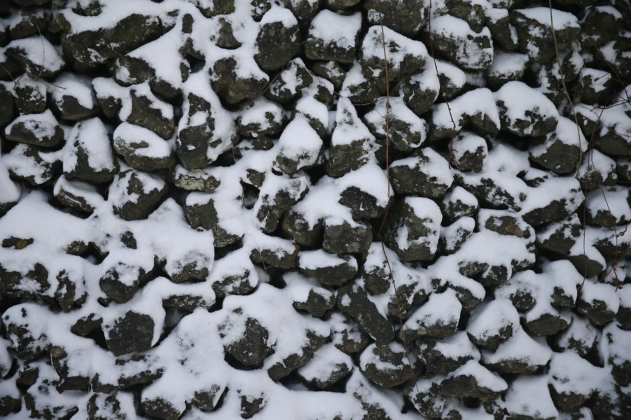 쌓인 것인지 붙은 것인지 모르겠으나 아무튼 눈은 돌담 사이사이에 끼어버렸어.