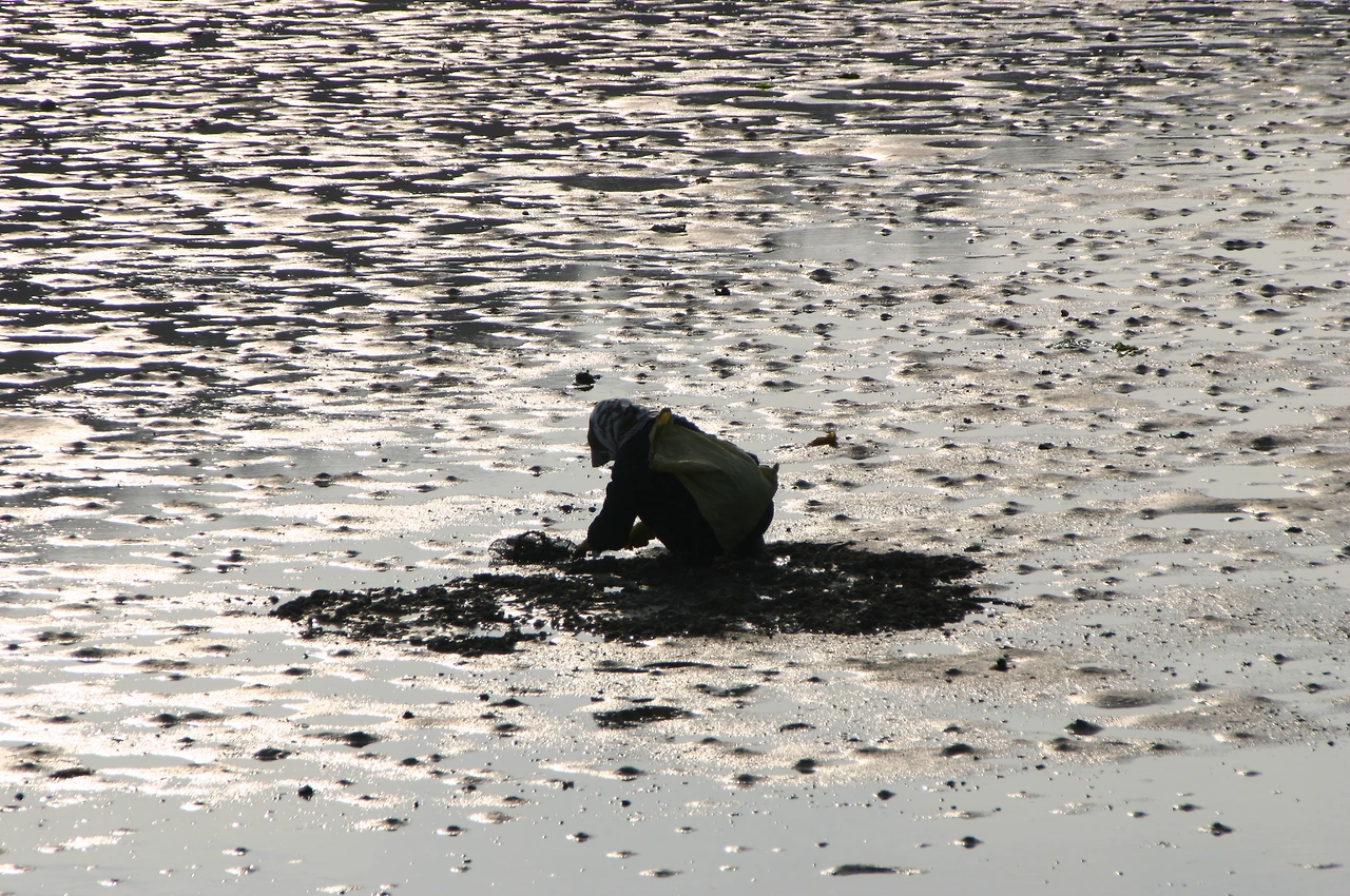 갯벌에서 할머니 한 분이 조개를 캐고 있었다.