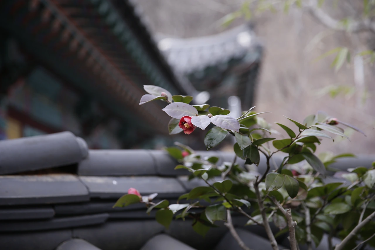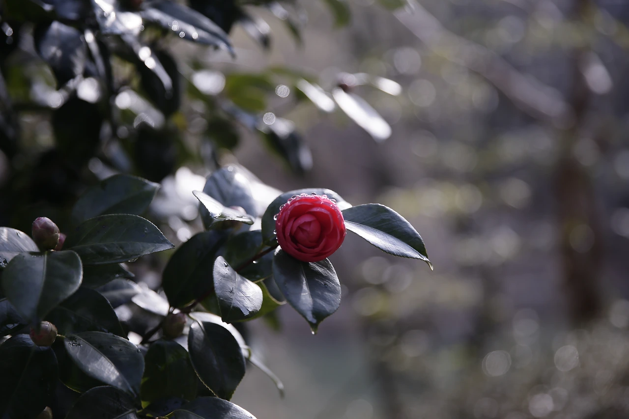 동백 이파리에 쌓였던 먼지는 말끔하고 피어난 동백은 비이슬을 보석처럼 달고 있다. 그리고 사철 푸른 대나무에 매달린 비이슬이 햇살에 동글동글 보케로 빛난다.