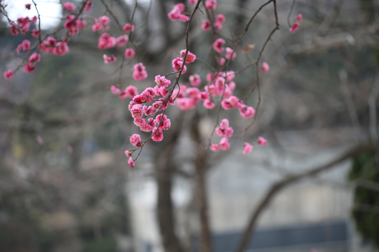 사진 왼쪽에 희미한 홍매화의 흔적 서너 개, 그것은 봄바람에 내리는 꽃비랍니다.