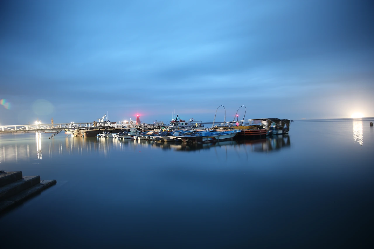 빛이 많지 않은 까닭에 ISO 100으로 고정을 시킨 후, 조리개 값에 변화를 주는 것만으로도 장노출을 담을 수 있었다. 눈에는 잘 보이지 않았는데, 선착장 너머로 큰 산이 드러난다.