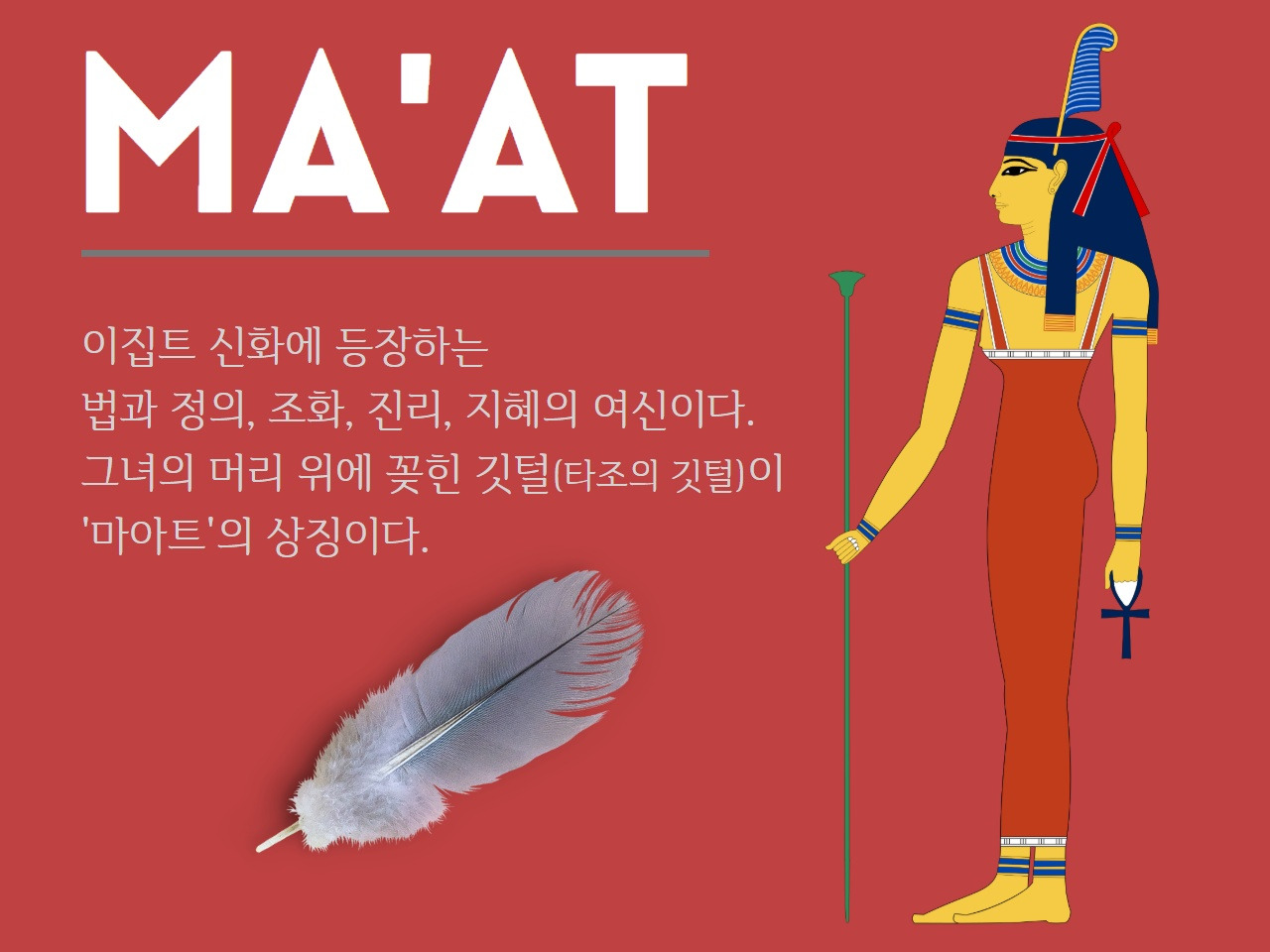 그녀는 진실의 신이요, 정의의 신이며, 법과 조화, 지혜를 총괄하는 여신으로 지상의 신이라 불리는 '파라오'조차도 그녀를 거스를 수 없었다.