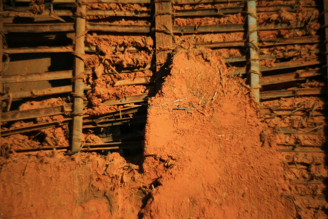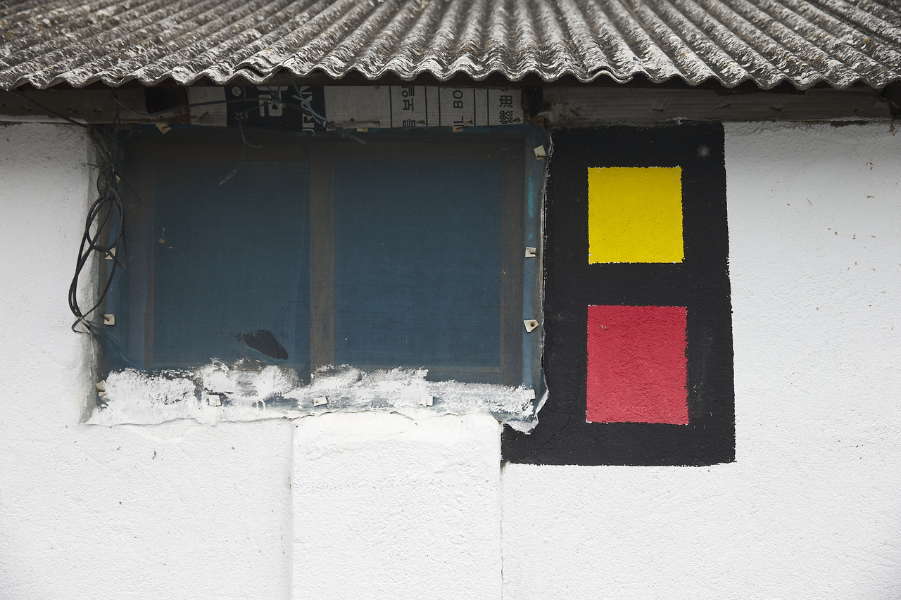 슬레이트 지붕과 벽 사이의 박스와 방충망을 고정시킨 장판과 못은 페인트로 그려진 노랑과 빨강의 축소판이다. 더군다나 슬레이트 지붕은 거뭇거뭇하여 스스로 오랜 세월을 버텨왔음을 증명하고 있다.