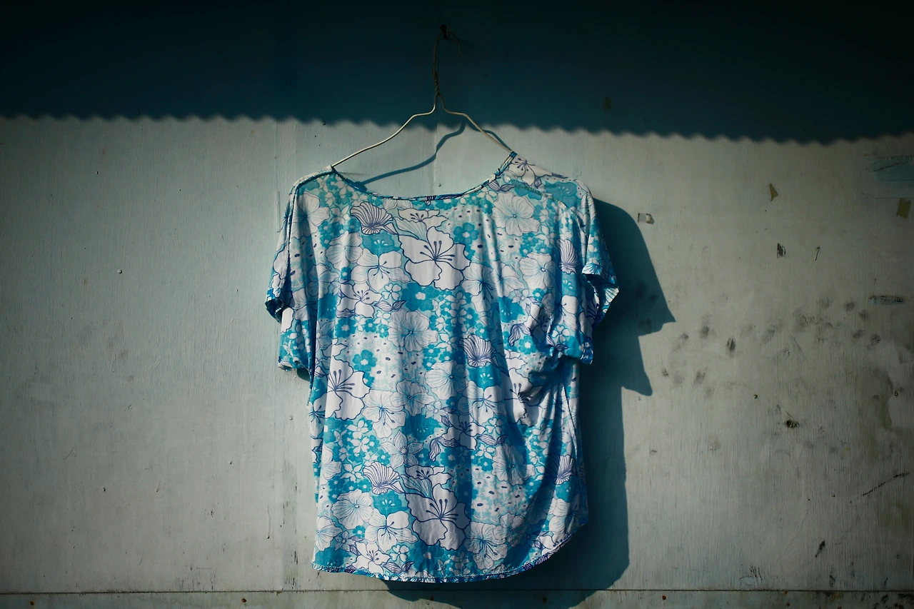 꽃무늬 옷은 벽과 적절하게 조화를 이루고 있으며, 시장에서 흔히 만나는 중년들이 좋아하는 무늬다.