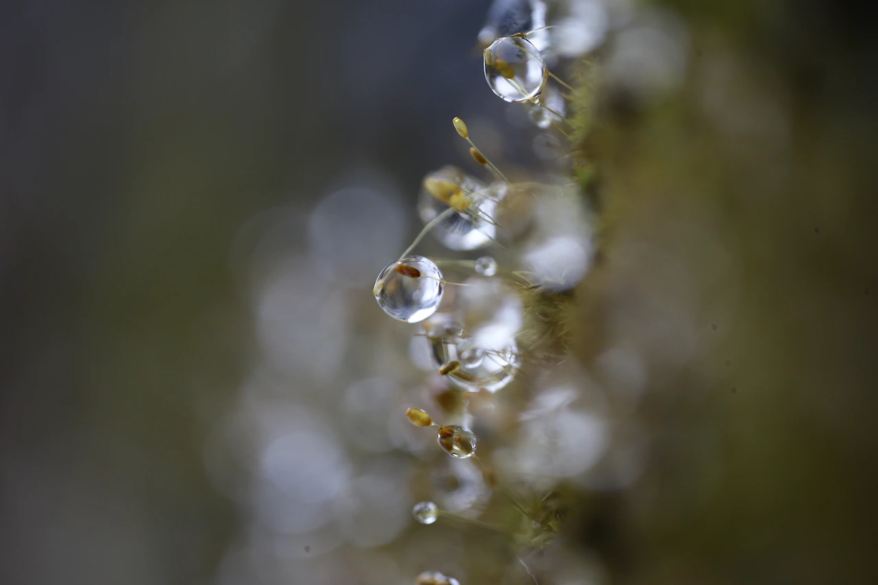 실처럼 가는 줄기에 피어난 삭, 겨울이면 이끼의 삭에 맺힌 이슬방울이 얼었다 녹았다를 반복한다.