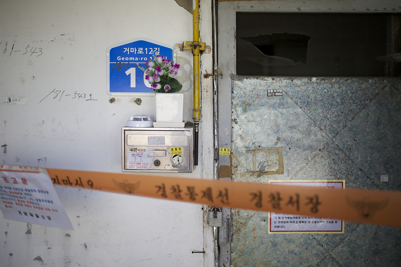 출입금지라는 폴리스라인은 더는 사람들이 살지 않는 집이라는 표식이며, 언제 무너질지 모른다는 위험표시다.