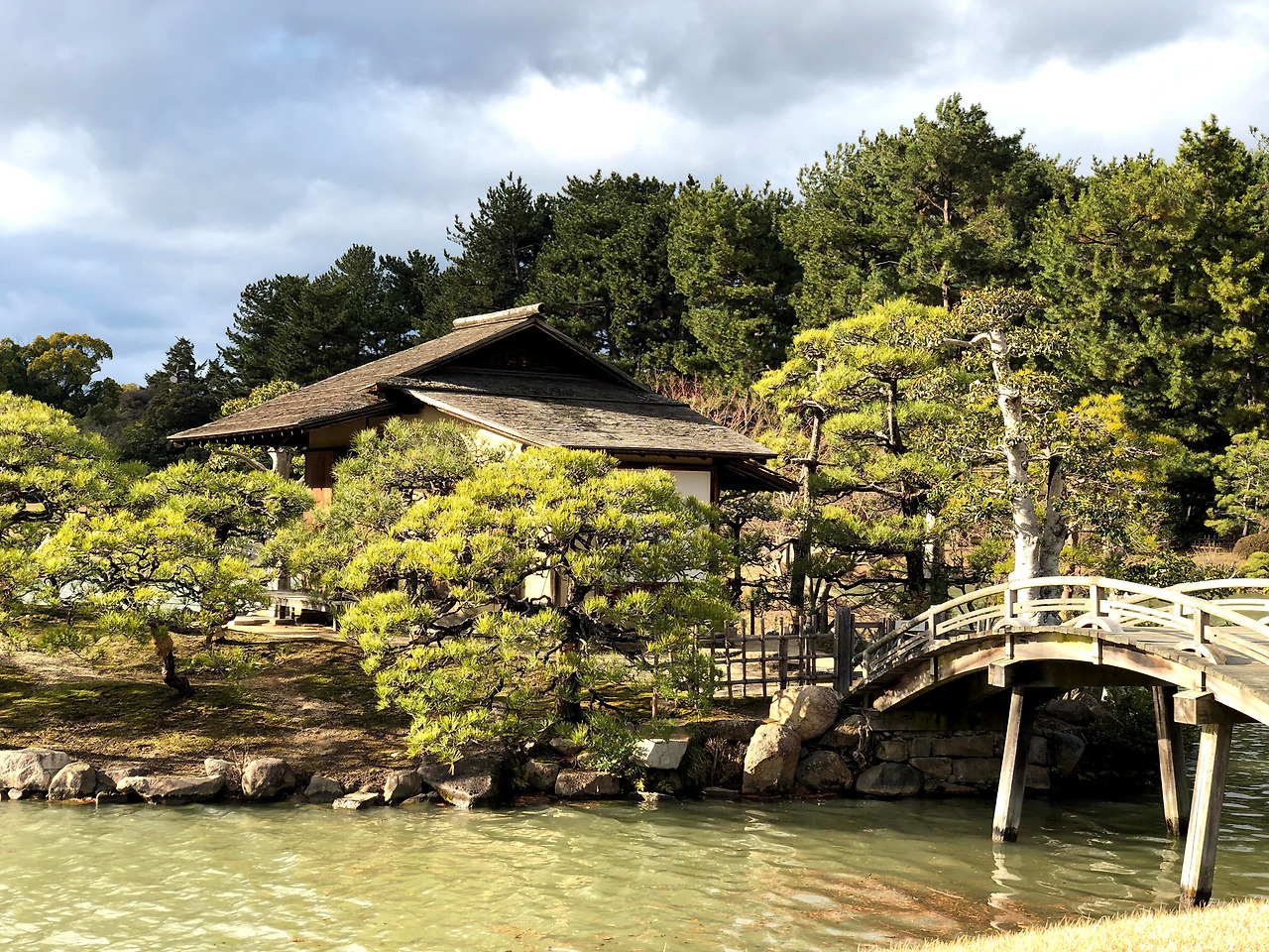 배도 채웠으니 고라쿠엔에 가볼까? 입장료는 410엔. 오카야마성과 같이 볼 수 있는 티켓도 있는데 문화제에는 그다지 관심이 없는 우리는 고라쿠엔만 둘러보기로 했다. 자전거를 입구 근처에 세우고 들어갔다. 서양인 직원이 웰컴 하며 우리를 반겨주었다. 마음이 차분해지는 정원이다. 깨끗하고 단정하다. 산책을 하다가 독특하게 깎인 지붕을 바라보고 있자니 아까 입구에서 인사를 하던 서양인 직원이 다가와 말을 걸었다. 친구가 영어를 할 수 있어서 둘이 대화를 시작했다. 그 직원은 자기가 고라쿠엔 페이스북 관리자인데 매주 고라쿠엔을 방문한 외국인을 찍어서 올린다고 했다. 이번엔 우리 둘을 찍고 싶다는 말이었다. 뭐 안될 거 있나. 알겠다고 답하고 그 특이한 지붕 아래에서 사진을 여러 장 찍었다. 그런데 이분 심상치 않다. 여러 가지 포즈까지 지정해주시면서 코치를 해주신다. 아이폰 에어드롭으로 사진을 받았는데 퀄리티도 상당했다. 뒷얘기를 들어보니 이탈리아 사람이고 부인이 일본 사람이라 여기에서 살고 있다고 했다.