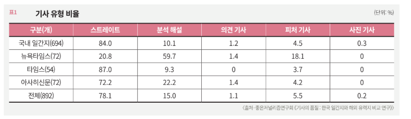 그렇다면 해외 언론은 다를까. 2018년 6월 한국언론진흥재단의 <신문과방송>에 게재된 좋은저널리즘연구회의 연구는 한국 신문이 기사 구성 방식에서 유독 형식적으로 경직돼 있음을 보여준다. 이 연구는 2016년 한 해 동안의 1면 기사를 분석해 국내 주요 일간지와 미국 뉴욕타임스, 영국 타임스, 일본 아사히신문을 비교했다.
