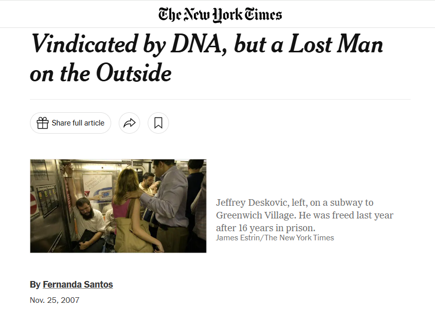 기사는 “1989년 이후 DNA 증거를 통해 전국적으로 최소 205명의 남성과 한 명의 여성이 무죄를 선고받았으며, 이들 중 53명은 살인 혐의로 유죄 판결을 받았던 사람들이다”고 설명한다. 데스코빅도 그들 중 한 명이었다.