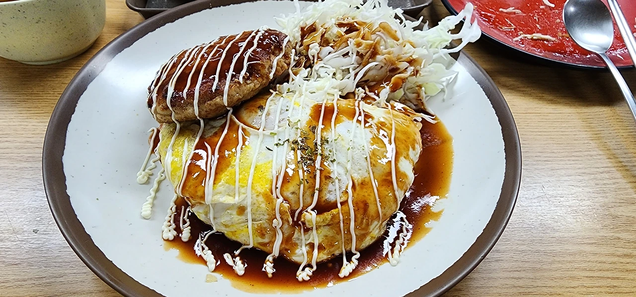 함박스테이크는 사진에서 보이듯 오므라이스랑 같이 준다. 국내에서 접할 수 있는 최상급의 함박이라는 느낌. 오므라이스랑 먹으니 양 많다. 저 메뉴만 먹어도 남자도 배 부를 양. 다만 별도 나이프 포크 같은건 주지 않으니 숟가락 젓가락으로 고기를 적절히 해체하여 먹으면 된다.