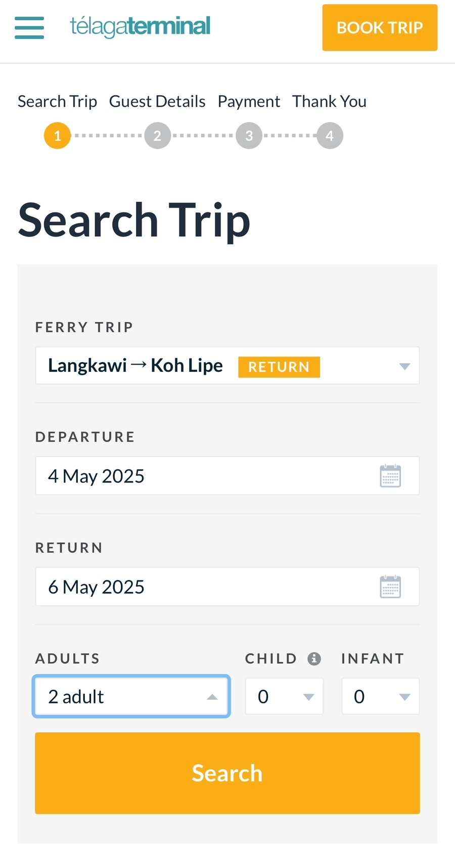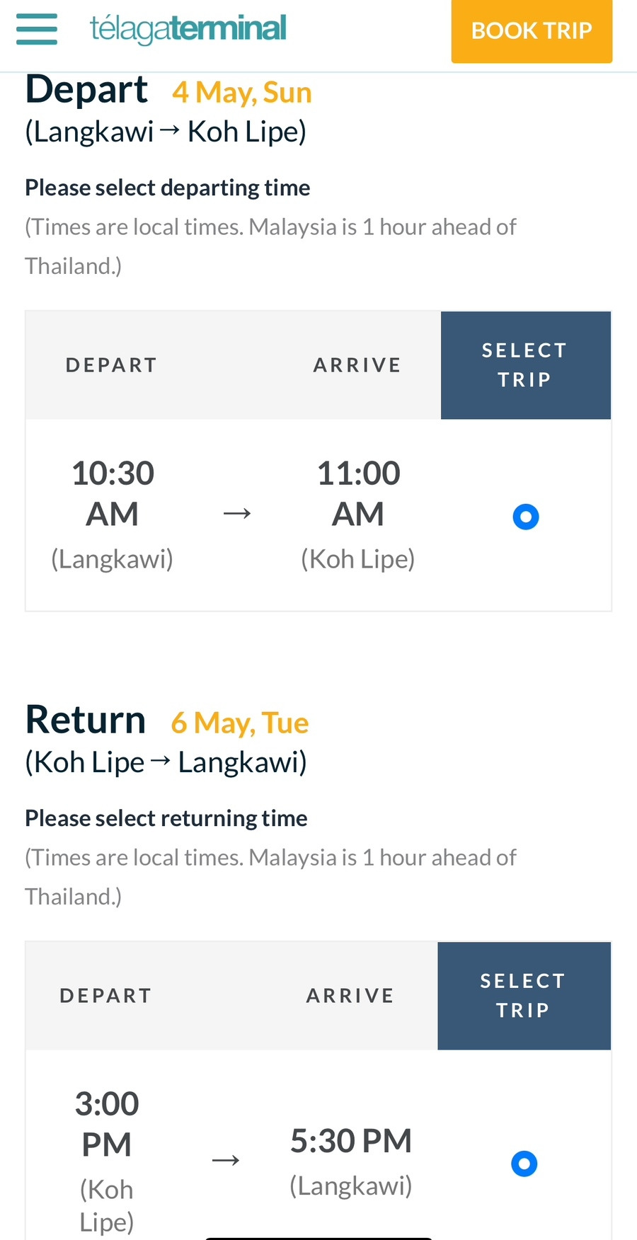 왕복 날짜 정확히 확인하고 Search 클릭하면 시간대를 고를 수 있습니다. 꼬리뻬는 우기인 5월~10월에는 위험할 수 있어서 입도가 제한되거나 금지되어 있다고 합니다. 저희가 갔던 5월 초에도 들어가고 나오는 배가 하루 한 타임밖에 없습니다.