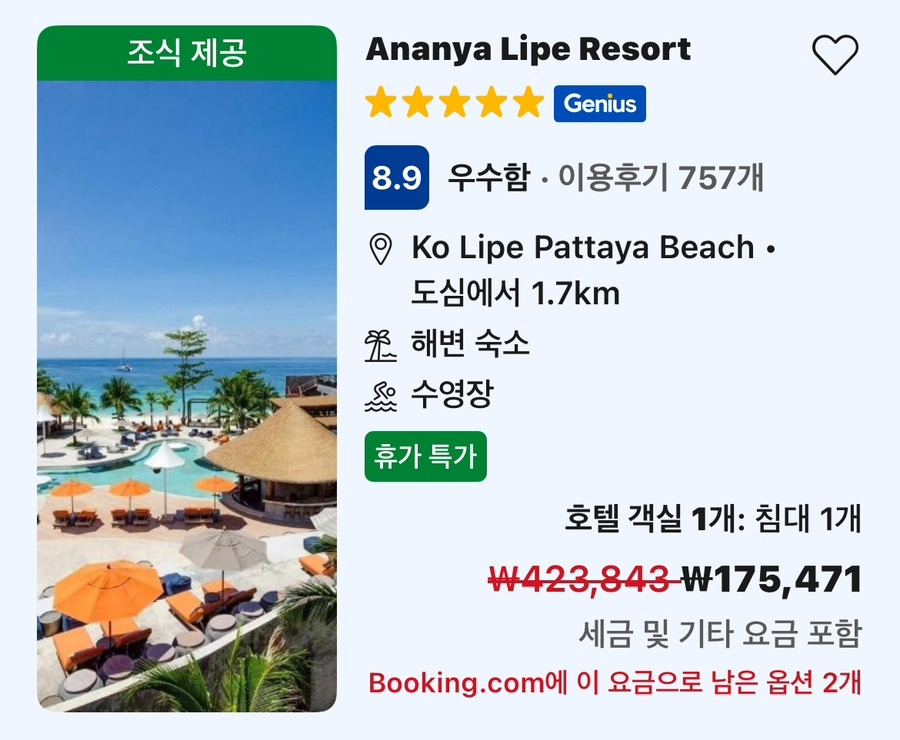 그리하여 첫날 숙소로 정한 곳은 파타야 비치에 있는 Ananya Lipe Resort입니다.