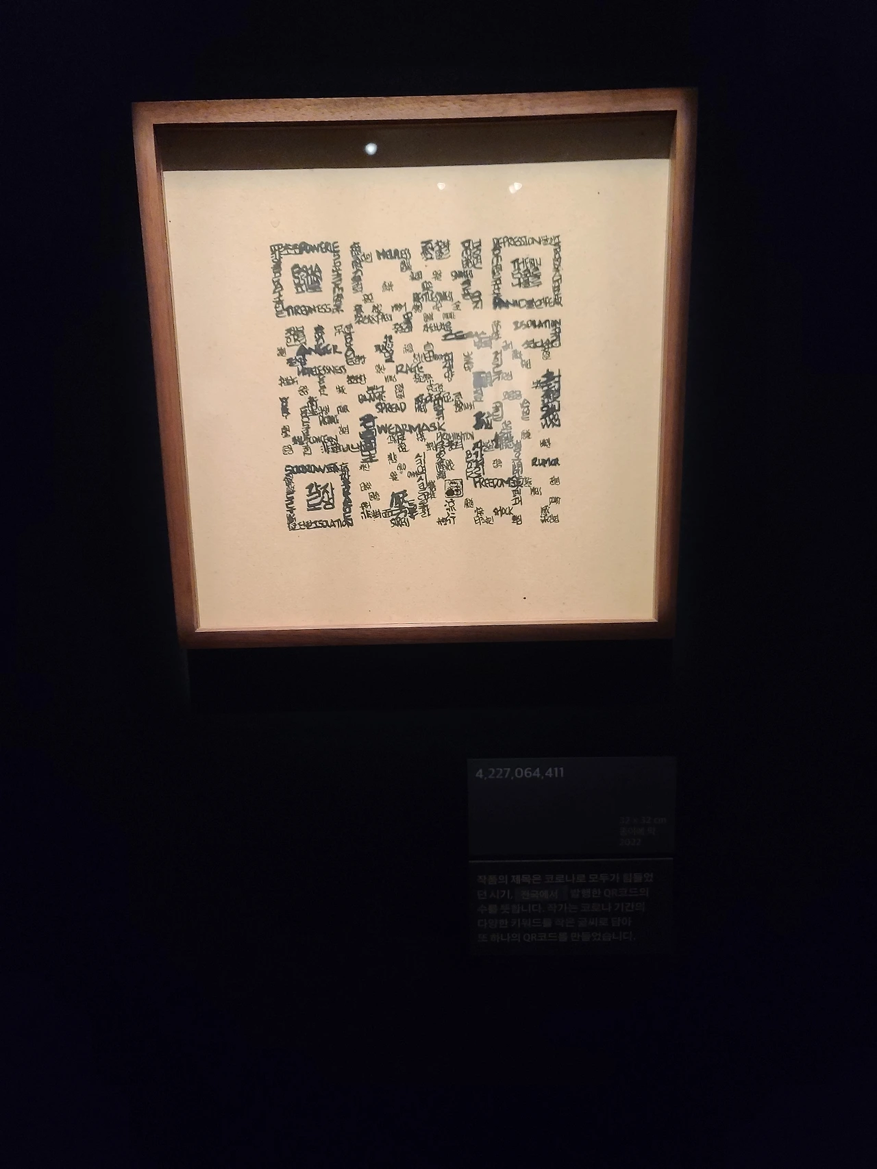 예를 들어 바로 눈에 띄는 <4,227,064,411>이라는 제목의 QR코드 작품은 그 다양한 실험 중 하나다. 코로나 시기에 자주 언급된 단어들로 구성된 작품인데, 제목의 숫자는 당시 전국에서 발행한 QR코드의 수라고 한다.