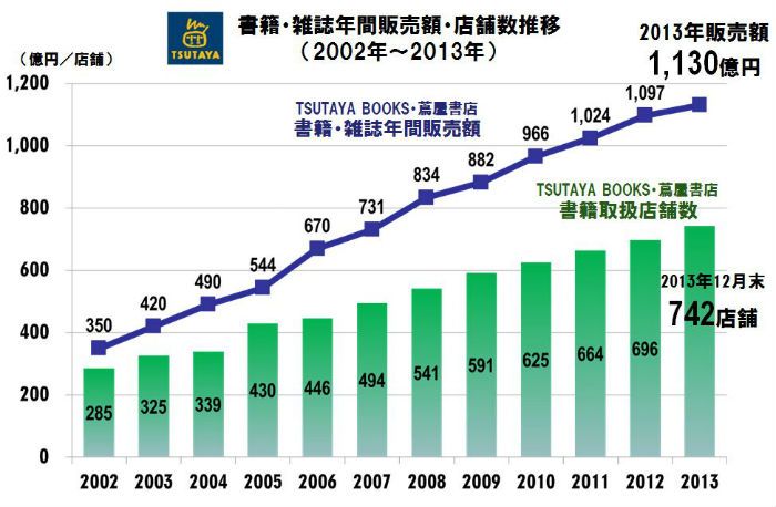 막대그래프는 TSUTAYA BOOKS의 점포수 / 선그래프는 TSUTAYA BOOKS의 판매액