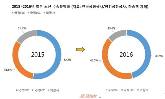 다음 그림은 일본 노선의 수송분담률을 보여주는데, 2015년 대비 2016년에 LCC와 외항사의 비중이 커졌음을 알 수 있다. 이때 외항사도 일본 내 LCC가 대부분을 이룬다는 점을 고려하면 LCC 비중이 급속도로 커졌음을 알 수 있다.