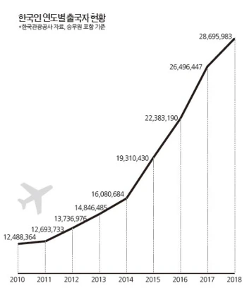 자유여행이 주류 여행 행태가 되기 시작한지 몇 년 지나지 않아 해외 여행시장 자체의 규모도 폭발적으로 성장하기 시작했다. 필자가 대학에 들어간 2015년부터 내국인 출국자 수는 전년 대비 20% 증가했으며, 이후 2017년까지 매해 20%가까이 증가해왔다. 2016년부터는 2천만 출국자는 기본이고 2019년에는 거의 2,900만 출국자를 기록했다.