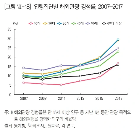 2015년을 기점으로 해외여행객의 수가 급증한 이유는 정리하자면, 1) 일본 정부의 인바운드 정책, 2) 아베노믹스로 인한 LCC의 일본 편 신규 취항, 3) 이로 인한 해외여행 가격의 하락 을 들 수 있다. 해외여행 가격이 하락하면서 여행을 가는 사람들의 유형 중 가장 많이 늘어난 것은 2030세대의 단기 여행이다. 2015년을 기점으로 시작된 변화는 2017년에 가서 극명하게 차이를 나타내는데, 20대와 30대의 해외여행 경험률이 다른 세대에 비해 가파른 성장세를 보이는 것을 통해 확인할 수 있다. 20대와 30대의 여행 수요가 늘어나면서 패키지 여행에서 자유 여행 중심으로 개편되는 여행시장의 흐름에 쐐기가 박혔다.