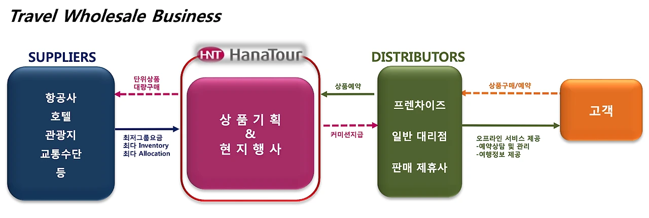 고객-대리점(소매점)-하나투어(도매점)-여행 관련 업종(항공사/호텔 등)