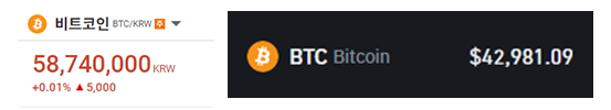 그리고 동시간 해외 거래소(바이낸스)의 비트코인 가격은 42,981.09달러입니다.