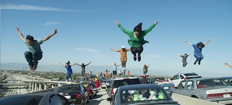 감독의 의도는 오프닝 시퀀스에서부터 바로 파악할 수 있습니다. 배경은 겨울, 꽉 막힌 고속도로 위. '미아'와 '세바스찬'이 첫 만남을 갖는 곳이기도 하죠. 짜증 나는 상황에서 사람들은 갑자기 차문을 열고 나와 얇은 옷만 걸치고 일제히 춤을 추기 시작합니다. 말도 안 되는 상황이지만 리듬감 있는 편집과 안무, 강렬한 색감은 드라마틱함을 최대치까지 끌어올려줍니다. 오디션에서 떨어진 미아가 친구들과 빨강, 노랑, 초록, 파랑 드레스를 입고 파티장으로 향하는 장면도, 미아와 세바스찬이 플라네타리움에서 데이트를 즐기다 공중으로 붕 떠오르는 장면도 바로 영화다운 요소들의 정수라고 할 수 있습니다.