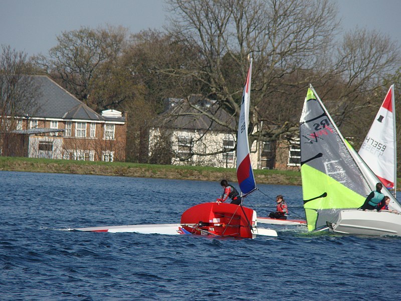 배가 뒤집힌다고? 그렇다. 딩기는 아주 작은 배라서, 조금만 돌풍이 불거나 조종하는 사람이 아차 실수를 하면 배가 뒤집힐 수 있다. 물론 순식간에 배가 홱 돌아가는 것은 아니고, 어… 어… 하는 사이에 배가 스윽 기울어져서 90도로 수면과 평행이 되며 누웠다가, 그대로 두면 세일이 수면 아래로 들어가면서 배가 밑면을 벌러덩 드러낸 채 180도로 뒤집혀버린다. 이것을 ‘캡사이즈capsize’라고 한다. 180도로 뒤집힌 것이 ‘완캡’, 90도는 ‘반캡’이라고들 말한다.
