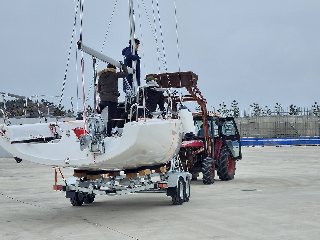 4. 육상에 올려두면 되겠...지? 배를 육상으로 올리고 내리고 하는 과정이 실제로 해보니 생각보다 힘이 많이 들고 번거로웠다. 우리는 인원도 네 명이고 몸 쓰는 일에는 이골이 나서 익숙해지니 할 만은 했다. 매번 갈 때마다 배를 띄워 훈련하고 나서 다시 육상으로 올렸는데, 앞뒤로 이 과정이 빨라도 30분씩, 길면 두 시간씩 걸렸다. 일단 바닷물에 들어갔다 나온 배와 트레일러에 묻은 소금기를 민물로 씻어내고 세차하듯 선체 안팎도 닦아주고, 선외기 엔진에도 물을 넣어 소금기를 빼내야 했기 때문이다. 다른 파이스트 선주들은 요트를 그냥 바다 위에 띄워놓거나, 한번 육상에 올려두면 몇 달간 바다에 내리지 않는 경우도 꽤 되는 것 같았다.