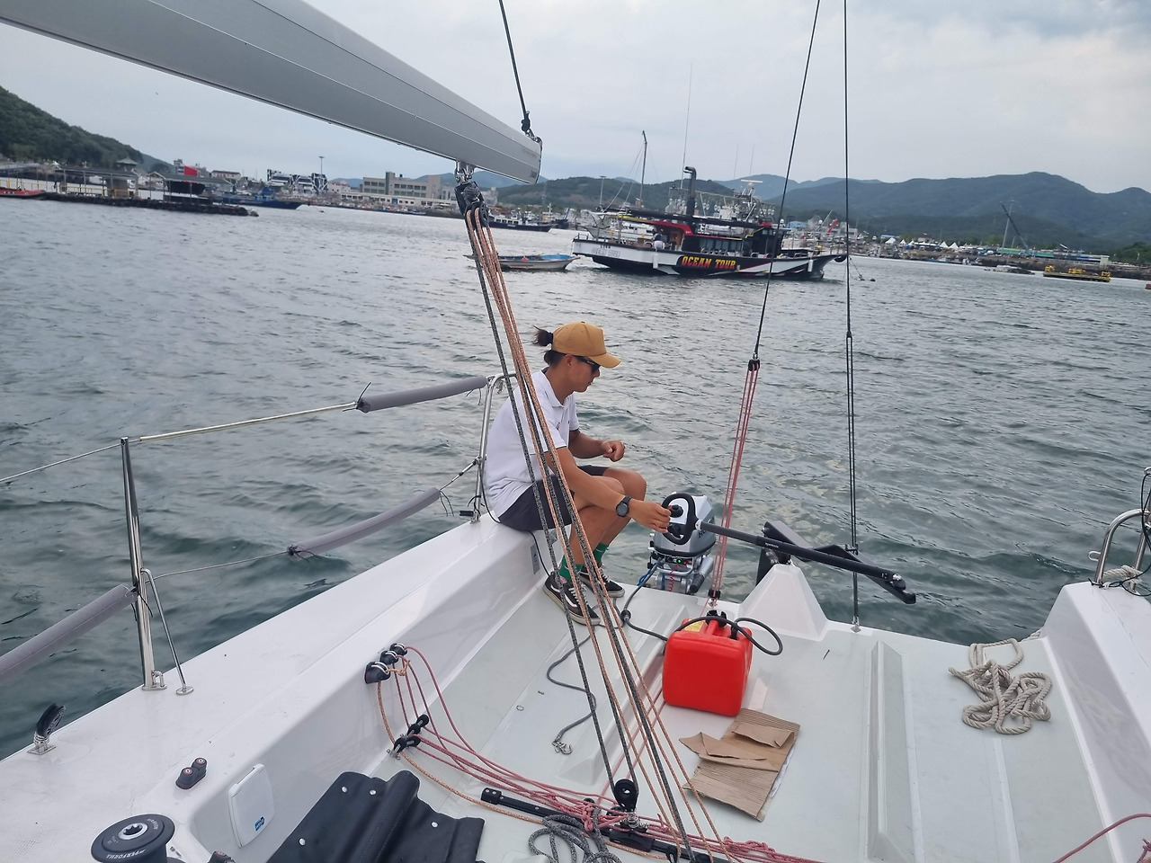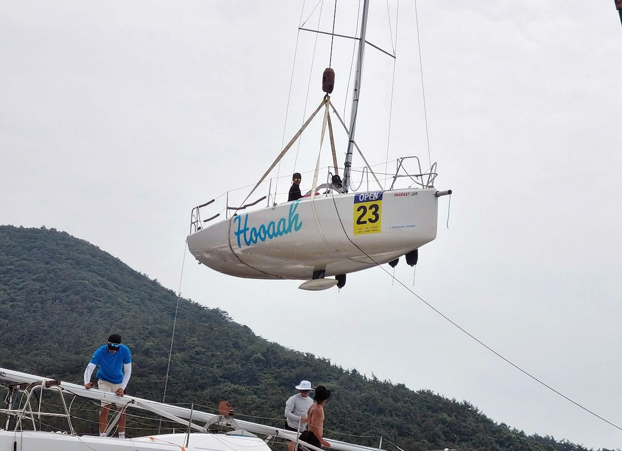 민진영과 나는 얼떨떨한 상태에서 하늘을 날아간 요트가 바다에 닿자마자 크레인에 걸려있던 끈을 풀고, 엔진을 내리고, 러더를 조립하고, 시시각각 항구의 벽을 향해 돌진하는 요트를 보호하기 위해 미친 듯이 라이프라인에 펜더(완충재)를 매고, 결국은 눈앞에 다가온 항구 벽을 발로 밀고 있는데 위에서 고함이 들려왔다.