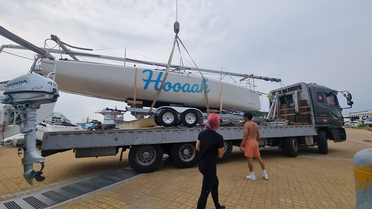 서해바다는 조수간만의 차가 커서, 우리가 도착한 시간대에는 요트 진입용 경사로인 '슬립웨이'가 너무 가팔라 쓸 수가 없었다. 그래서 요트대회를 위해 참가한 배들은 크레인으로 마스트를 들어 올려 조립하고는, 천으로 된 끈 두 줄 위에 배를 얹은 후 그대로 10미터 정도 하늘 위로 올라갔다가 다시 20미터를 내려가 바다 위에 사뿐히 놓였다.