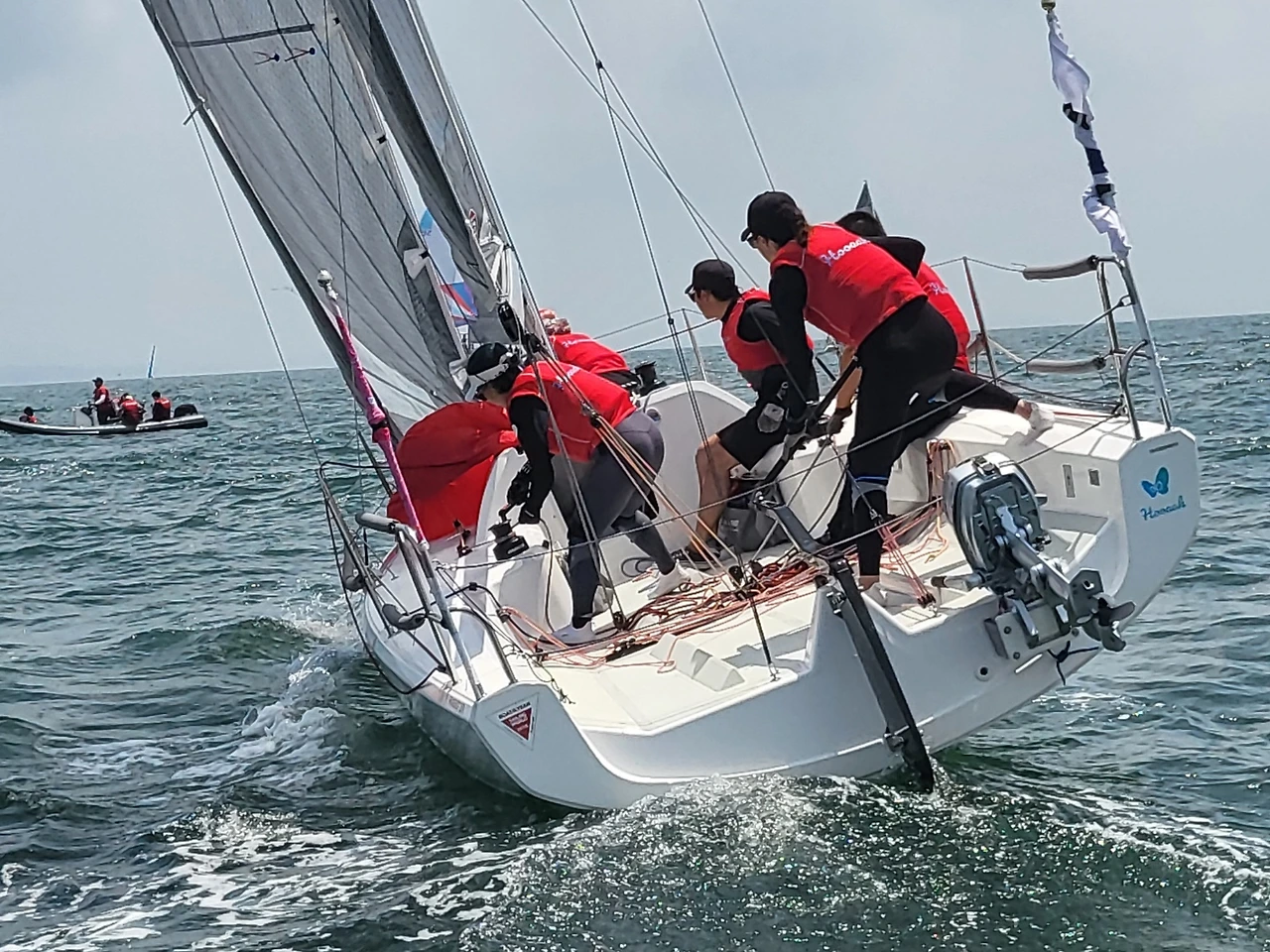 평소라면 말도 붙여보기 어려운 선수들과 배를 탄 우리는 바짝 얼어 있었다. 반면 선수들은 반쯤 놀러온 분위기였는데, 이런 대회는 본인들의 커리어와 무관했기 때문이다. 선수들은 민진영이 배 앞머리에서 이리 뛰고 저리 뛰며 바우맨 역할을 하자 그 움직임을 흥미롭게 지켜보기도 했다. 1~2인승 딩기에는 바우맨이라는 역할이 없기 때문에 그랬던 것 같다.