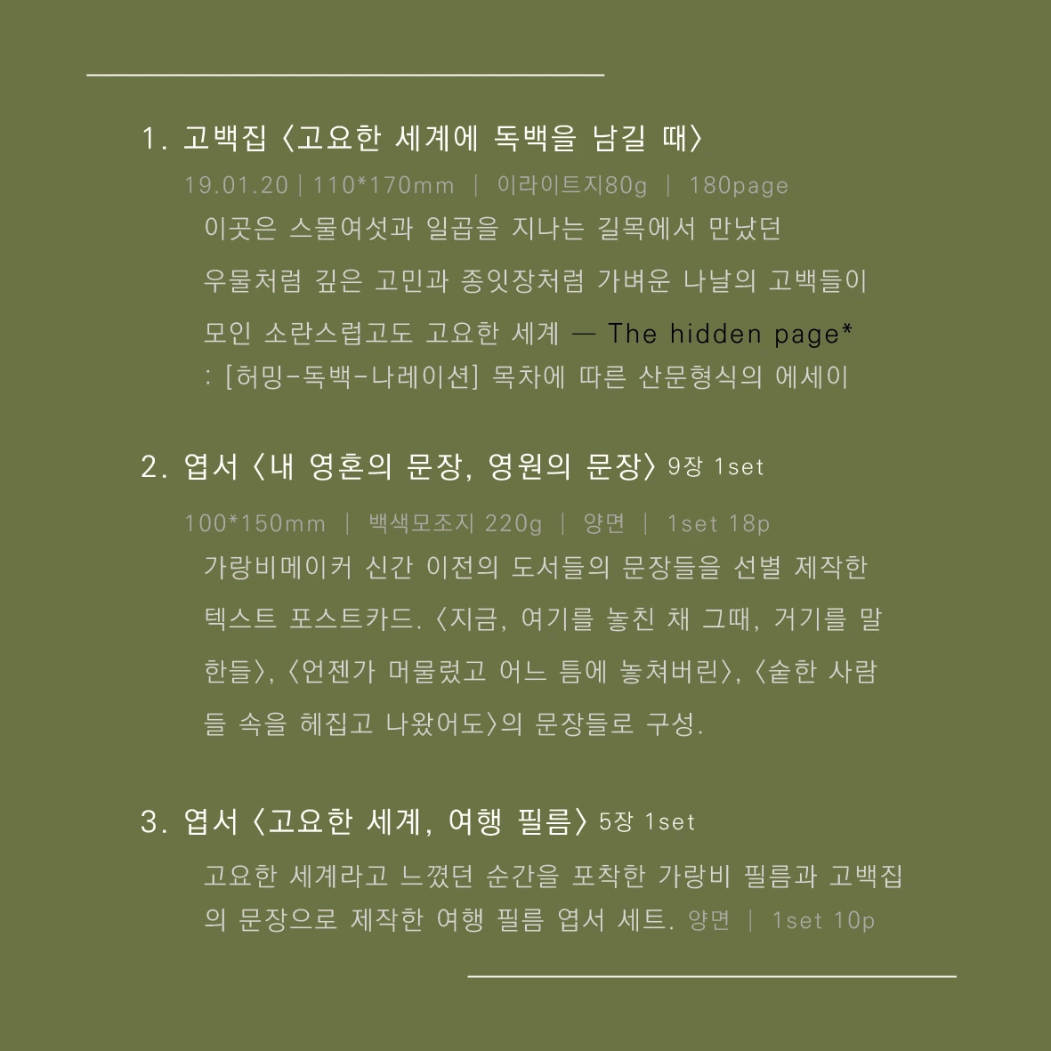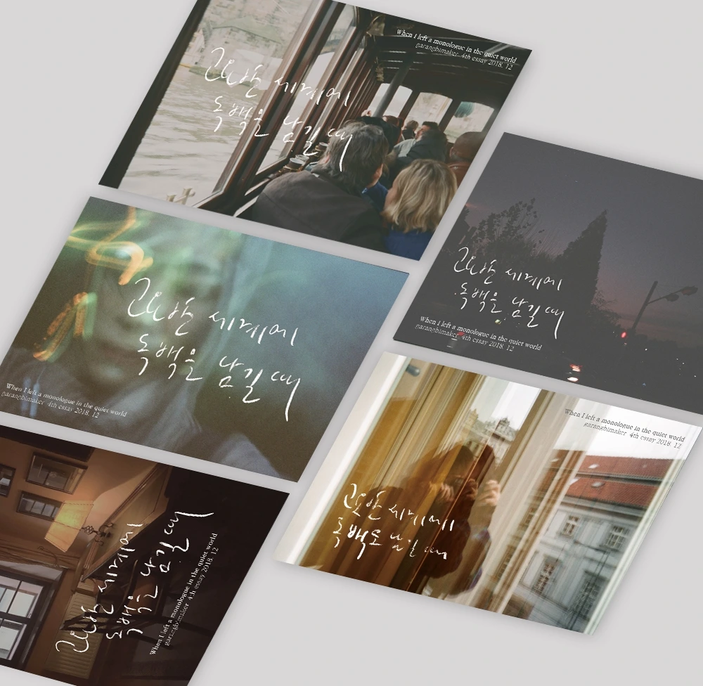 그전에 먼저 책과 이번 제작 굿즈인 엽서 세트 <내 영혼의 문장, 내 영원의 문장>, <고요한 세계, 여행 필름>의 개별 주문을 받고 있습니다. *발행 예약 글이며 현재 인도네시아 체류 중입니다. (9일 입국)