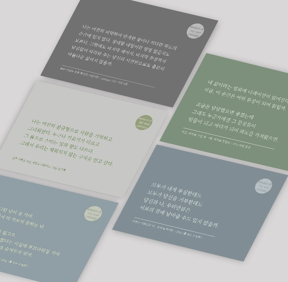 엽서들은 모두 직접 촬영 및 디자인한 제작물이며 단단하고 부드러운 질감의 백색 모조지, 양면으로 제작되었습니다. > 자세한 내용은 해당 링크를 통해서